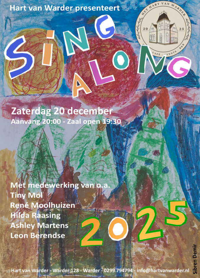 Op zaterdag 20 december verandert Het Hart van Warder in een sfeervolle muzikale huiskamer tijdens onze jaarlijkse Sing Along. Vanaf 20:00 uur zingen we samen de mooiste kerstliedjes, begeleid door een geweldige line-up met o.a. Tiny Mol, René Moolhuizen, Hilda Raasing, Ashley Martens en Leon Berendse.